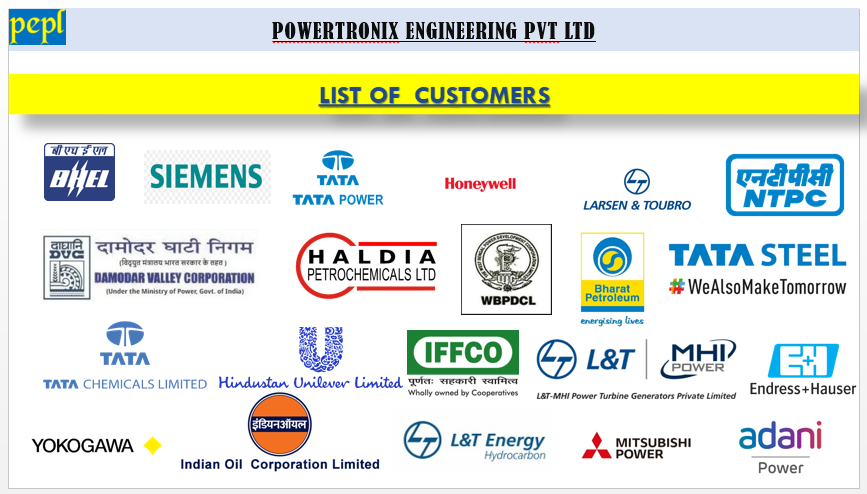 CLIENTELE LIST OF OUR VALUED CUSTOMER BHARAT HEAVY ELECTRICALS LIMITED M/S SIEMENS LIMITED M/S TATA ELECTRICPOWER COMPANY LIMITED M/S HONEYWELL AUTOMATION INDIA LIMITED M/S LARSEN & TOUBRO NATIONAL THERMAL POWER CORPORATION DAMODARVALLEY CORPORATION M/STISCO LIMITED M/S HALDIA PETROCHEMICALS LIMITED M/STATA CHEMICALS LIMITED M/SYOKOGAWA INDIA LIMITED M/SHINDUSTAN LEVER M/S WEST BENGAL POWER DEV. CORP LTD M/S INDIAN OIL CORPORATION LIMITED M/S BHARATPETROLEUM CORP LIMITED M/SIFFCO M/SENDRESS & HAUSER M/SL&T MHI POWER M/SL&T ENERGY HYDROCARBON M/SMITSUBISHI POWER